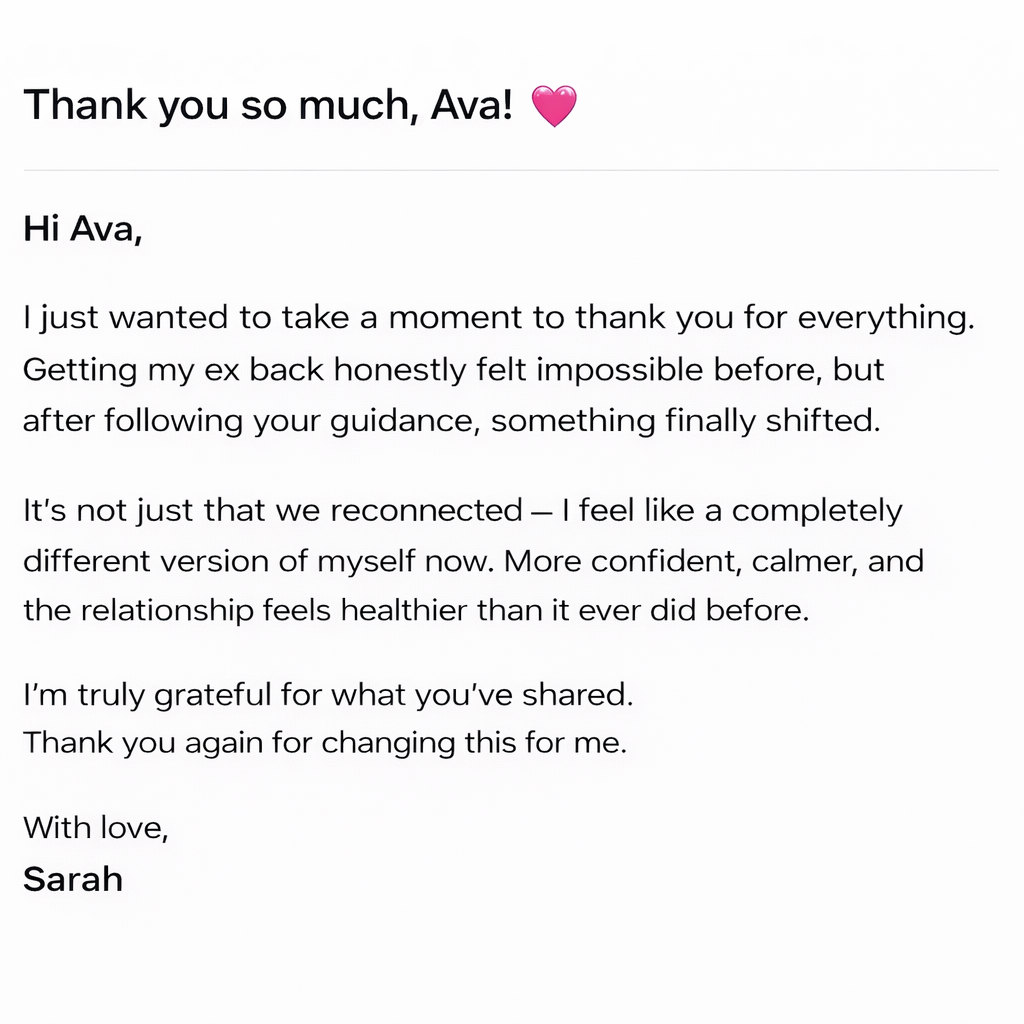 We’d been apart for almost a year and I had tried everything — no contact, coaching, even therapy. I did this ritual with no expectations. Six days later, he reached out wanting to “catch up.” What shocked me most was how calm and confident I felt responding. That alone changed the entire interaction.
